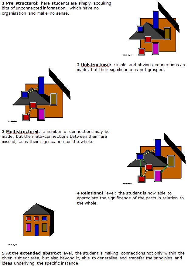 Learning is a cognitive process as well as a social one, and individual and a collective one; it can be quantified by behavioural change, increased speed in finding solutions and in many other ways. Learning is complex and thus described it in many ways; many learning models reflect different assumptions on the nature of learning. As I favour innovation over convention, to me learning is not about the retention of information, rather the application of knowledge, the creation of new links and perspectives. The SOLO taxonomy learning framework shown below provides different types of learning, the relational and extended abstract level covering the type of learning I am interested in.