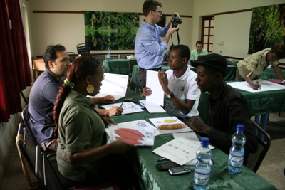 With so many different points of view represented it has been an interesting week, with a lot of lively discussion about the best ways to use the ExCiteS methods and tools in the field. The first day was mostly spent brainstorming about the best ways to achieve an effective and balanced participation with the local population, on the positives and negatives of using digital technologies with remote and non-literate communities, and on what kinds of things it might be important to agree with a local population when putting a wider project in place. The second day was spent familiarising people with the Sapelli suite of tools – particularly the Collector and Launcher, followed by some detailed discussions about how to put together an effective decision tree and how to adapt the tree collaboratively with local people using ExCiteS’ process of iterative, participatory software development. Finally, on the third day, the cohort divided into project teams and began designing decision trees of their own – which I made into usable files as quickly as I could (many thanks to Julia for her excellent training!) so that each team could test their ideas. The Lynapyco team adapted the community mapping icons that ExCiteS developed for Congo-Brazzaville in order to make them more suitable for use in the DRC context and outlined a much simplified tool for communities to report conflicts with other actors (with the idea that the communities themselves can request more complicated functionality if they feel it’s necessary). Meanwhile, representatives of OSFAC and OGF worked on translating OI-FLEG and OI-REDD indicators into a decision tree that would be relevant for local people – their final app will incorporate the community cartography decision tree made by Lynapyco and will be tested next week during four days working with forest communities in Ingende. It’s going to take two days to reach the field site and we depart early tomorrow morning. So, until I return to Internet range once more, Njoli! (That’s goodbye in BaTswa – the indigenous language spoken in Ingende).
