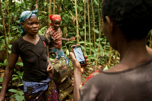 However, although we had only a fairly small amount of time to work with local people, their reaction to the ExCiteS tools, and to the prospective benefits of participatory mapping, was encouraging. We worked in three teams – two teams of men and one of women – and my colleagues were satisfied both that people were able to manipulate the software well and that the forest monitoring and mapping decision tree created during the training week in Kisantu was largely relevant (although there are still many suggestions to incorporate). Indeed, OGF intends to bring the data we collected concerning the community’s issues to the attention of the concession holder and will report back to the Tswa on the company’s reaction. The women I worked with were very keen both to demonstrate in photos what different kinds of resources were used for, and that we should add icons for other types of resource that are very important for their daily activities (mongongo leaves, honey and edible ants for example). They told me they felt the software was very well adapted for them, and they were curious as to whether they would be able to have a record of the points they had mapped – a good sign that ExCiteS’ work developing a GIS tool for non-literate people (Sapelli Maps) is likely to be appreciated. Most importantly for me, they said that if we were to return then they would give us a very good welcome, as unlike other NGOs they were very happy with the way we had worked with them so closely.