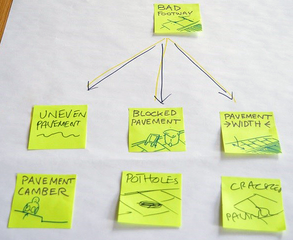 The workshop commenced with a brainstorming session about the barriers encountered on a daily basis in the public realm and these were then classified into logical groups. Participants went out into the ‘wilds’ of Carshalton to capture photographic and audio material based on the good, bad and the impassable! Going out and physically identifying issues was done primarily to explore whether there were missing gaps to what had already been identified as barriers, which indeed it did. The exercises set the scene for the next step in the co-design process. Based on the different groupings that were further refined participants began to construct the decision tree which they decided should focus on what they were trying to achieve – crossing for example – and the identification of barriers that prevented them from achieving that particular goal. In the design of the decision tree people were keen to see that best practice and positive examples were also recognised and captured.