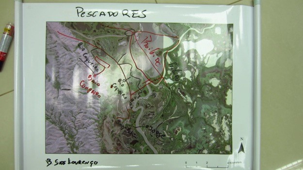 This alternative method consists of displaying local knowledge about the issue in question on a satellite image (Chambers, 2006; Stephanson and Mascia, 2014). In the case of this project I sought to represent on the map issues related to land tenure and the use of natural resources by local people and other stakeholders. Images from the new Brazilian collection of satellite images “Rapid Eye” with 5 meters of resolution in a 1:20 000 scale were used. In total 8 different maps were printed that taken together covered the whole Western Border of the Pantanal region.