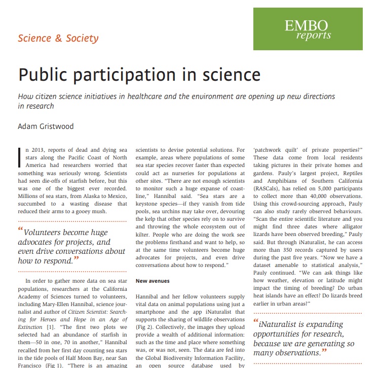 Some citizen science projects aim to engage fewer people, but at a deeper level of involvement. In the jungles of eastern and southern Cameroon, Muki Haklay, a geographer and a computer scientist, and Jerome Lewis, an anthropologist at University College London, UK, and their Extreme Citizen Science team work with the Baka, a community of hunter‐gatherers, to tackle illegal poaching of animals such as forest elephants, lowland gorillas and chimpanzees via a co‐developed app to monitor and report criminal activity. Data are then fed to the Zoological Society London, UK, where researchers and international law enforcement aim to understand how wildlife trafficking networks are operating. Anthropologists spend time with the communities to build up trust and define problems and devise ways to tackle them. “Some of the participants have never used smartphones before: it is critical to involve them in the design process in order to deliver something that makes sense to them in their specific environment,” said Haklay, who leads an European Research Council (ERC)‐funded project that aims to develop citizen science initiatives in some of the most remote places on earth…”