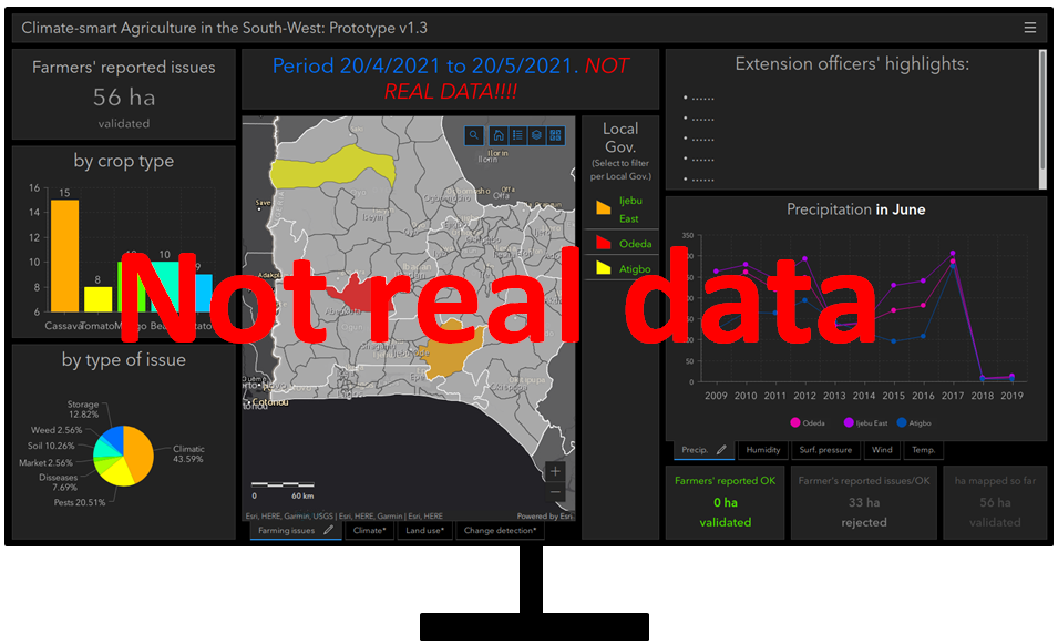 Towards the end of the project we quickly prototyped a Spatial Decision Support System (SDSS) using the ArcGIS Operations Dashboard to explore how the farmer/land user-generated data could be aggregated in order to provide key, validated information for decision makers – the data processing and validation is represented with the ‘transparent box’ shown in the second image of this post. Below is included a screenshot of the SDSS showing climatic data and not-real, aggregated data about total hectares affected by crop type and by farming issue in each of the three local governments. As mentioned, little progress was made in this front and only very few farmers have reported farming issues since the mapping phase started in mid April.
