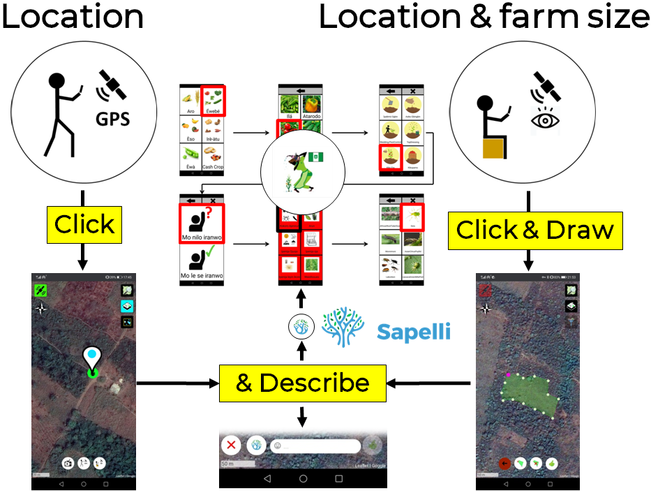 As part of the engagement and Free Prior and Informed Consent process we co-designed, with few iterations due to logistics and other constraints, the Sapelli project (pictorial interfaces with captions in Yoruba) based on the feedback received from farmers and extension officers and the EERC staff’s extensive knowledge on farming related issues such as soil, pests, diseases, weather, storage or market. This first phase focused on engaging farmers and extension officers, and identifying what do people want to report/map. The next phases focused on exploring how this can be mapped and shared. In terms of mapping, we discussed and agreed that information about both location and farm size was important and we tried to adapt the technology accordingly to allow farmers to not only locate their farms using GPS, but also to demarcate them using satellite imagery. The images below represent these two mapping techniques and the text and pictorial interfaces for describing a geometry, i.e., the semantics of a point, line or a polygon in a map – the map legend and meaning.