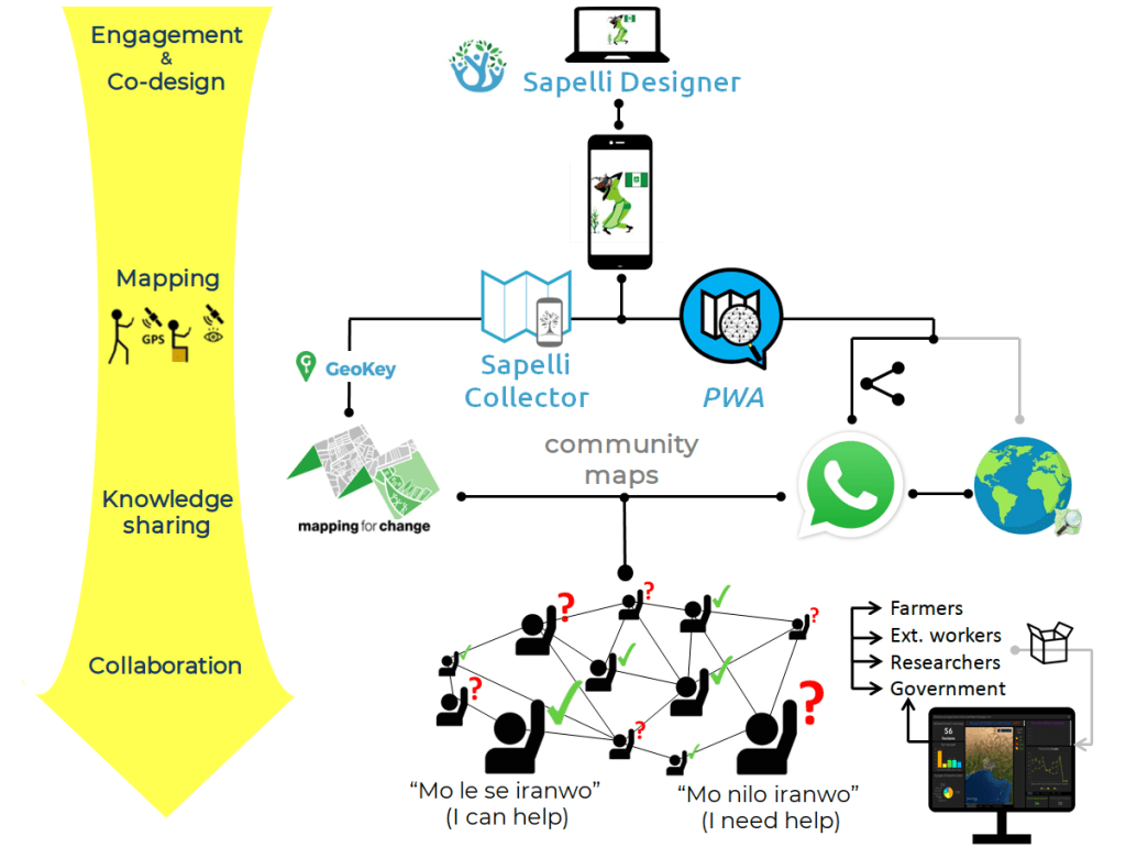 The work focused on: 1) exploring, through the implementation of co-designed ‘working’ prototypes, how digital tools can support – directly or indirectly – any smallholder farmer in reporting and mapping farming issues and receiving timely advice from extension officers and other farmers; 2) discussing and prototyping how the land use data and knowledge shared in these farmer to farmer and farmer to extension officers interactions can be appropriately converted into key information for making evidence-based decisions. To address some technological gaps that were identified at the early stages of the project we explored the implementation of Sapelli and Community Maps in two different ways aiming to contribute to enhance such collaborations. The process and the technology used is represented below and briefly explained in the next sections.