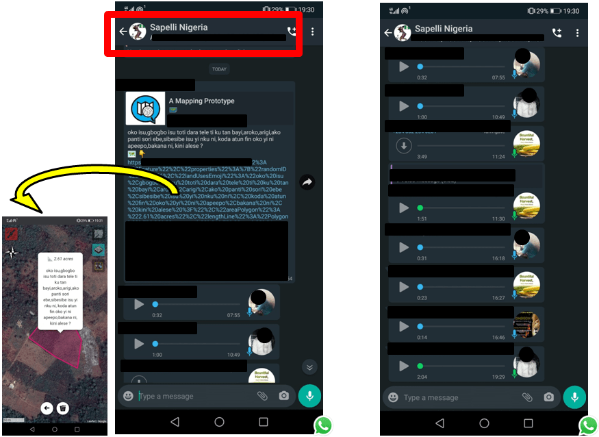 The image below ‘summarises’ the socio-technical approach of the sharing knowledge phase by showing a screenshot of the Sapelli Nigeria WhatsApp group where farmers can message maps to report farming issues and receive timely advice from extension officers and other farmers who are facing similar issues. Maps can be created and added to WhatsApp (or other messaging apps) while offline, but they will only be sent automatically when online. The maps can also be shared via SMS.