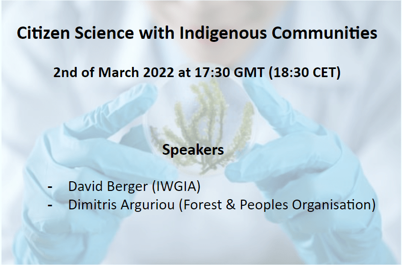 - Citizen Science with Indigenous Communities with David Berger (IWGIA) and Dimitris Argyriou (Forests & Peoples Organisation) on 2nd March, 17:30 pm GMT. Tickets here.