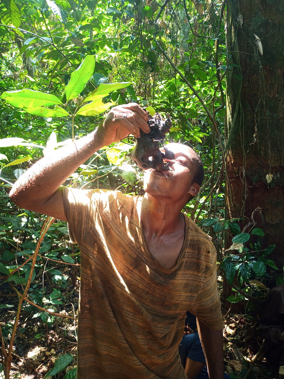 En voyant une abeille me passer sous le nez un baka en joie crie « pendé » ! Il se met à creuser la terre au pied d’un arbre et déterre avec précaution une grosse ruche noire débordante de miel liquide. Nous nous en délectons. Une fois remplis d’énergie, nous reprenons la marche.