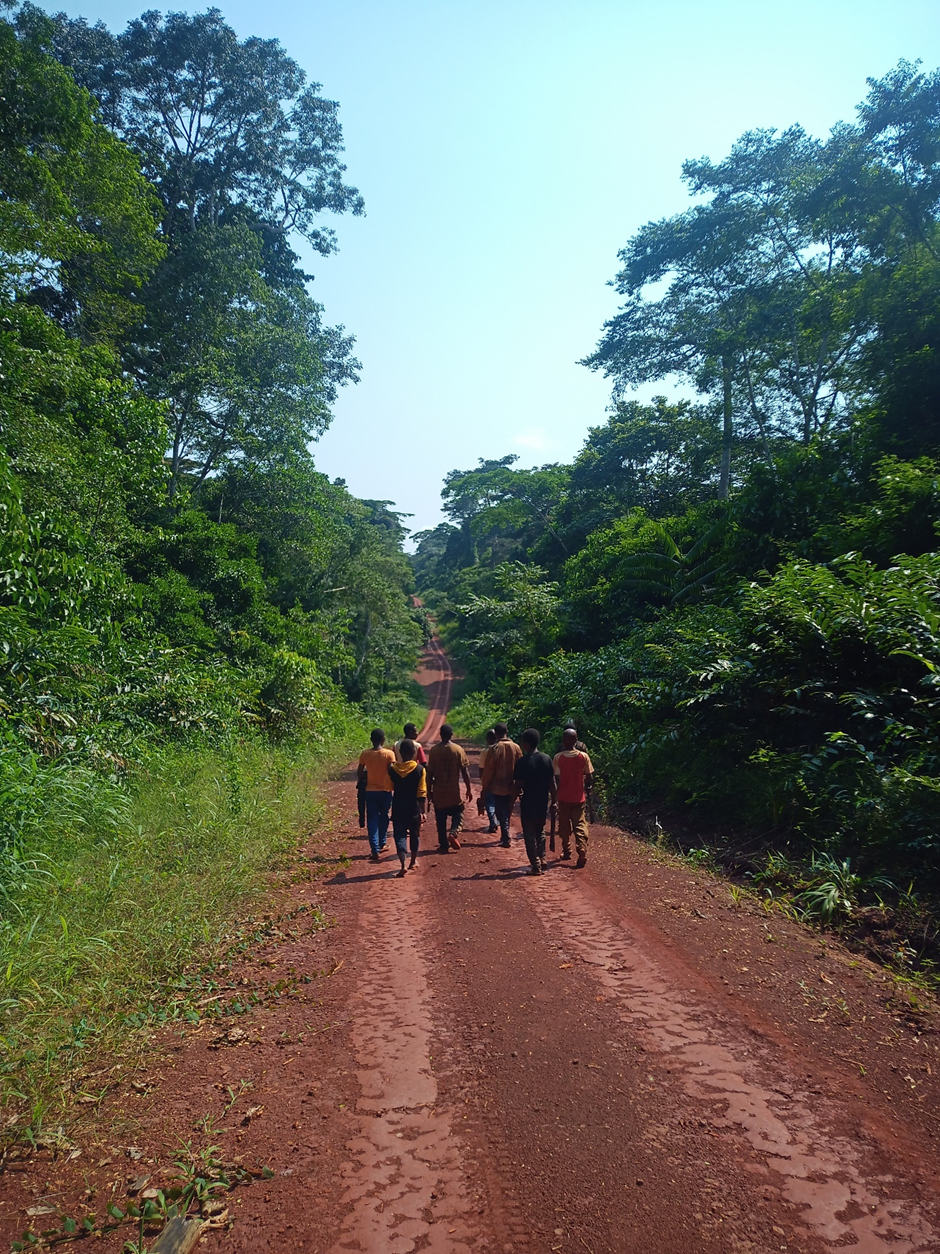 Je pensais que cette forêt n’aurait pas de fin mais une piste rouge sang vint trancher notre marche. Les Baka sont aux aguets lorsque nous accostons sur cette route sortie de nulle part. Des gardes armés la sillonnent régulièrement pour garder sous contrôle un safari et il n’est pas rare qu’ils persécutent les Baka qui viennent y chercher un peu de viande, d’igname, de chenilles ou de mangues sauvages. En pratiquant leur mode de vie traditionnel, les chasseurs-cueilleurs autochtones sont souvent considérés par les autorités comme des braconniers car leurs terres ancestrales ne leur appartient plus. Que ce soit par la présence des safaris, des mines, des concessions forestières, ou des parcs nationaux, leur accès à la forêt est compromis. Or, sans les ressources de la forêt, les Baka ne peuvent survivre. Il ne leur reste alors plus qu’une vie de misère, de subordination, et de dépendance.