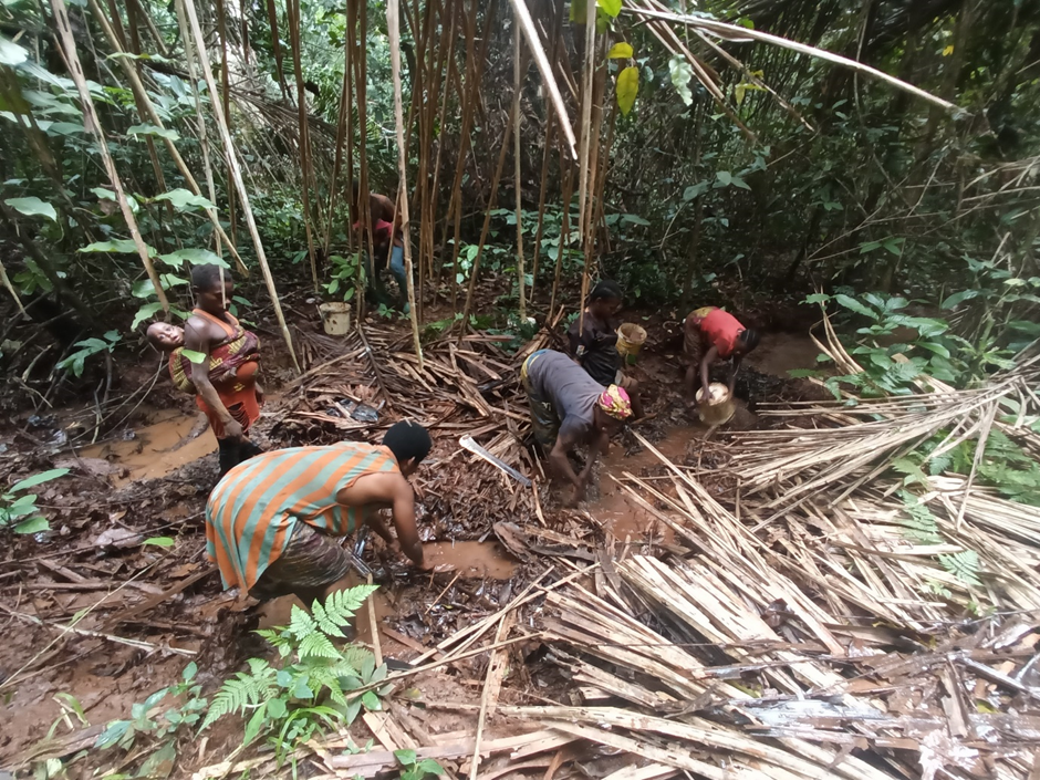 Sur le chemin du retour, la forêt chante. Nous trouvons les femmes en train de pêcher au détour d’une rivière. L’activité leur est réservée. Elle se pratique dans les zones marécageuses dans lesquelles s’écoulent de petits ruisseaux. Les femmes construisent une série de barrages éphémères le long de ces ruisseaux et extraient l’eau entre chaque barrage. Il ne reste alors qu’à prélever les petits poissons barbus qui tentent de se défendre en gesticulant avec leur nageoires piquantes. Certains d’eux repoussent les mains expertes des femmes à coups de décharges électriques. Une vieille femme, illuminée par une trouée de soleil dans la canopée, les deux pieds dans la boue du marécage, me regarde et me dit en souriant : « Bélé é ngobo lé (la forêt est mon corp) ». Une fois les paniers remplis de poissons, les hommes se joignent aux femmes et nous rentrons en une longue file indienne chantante.