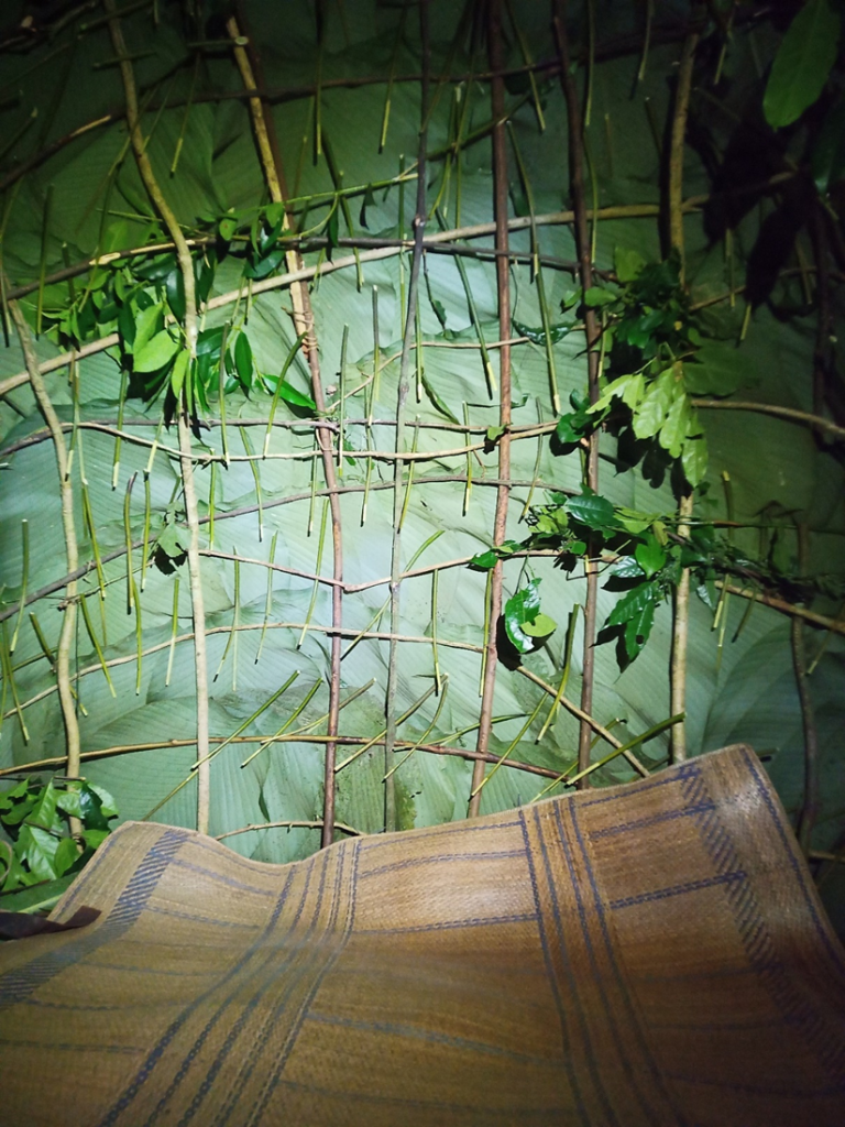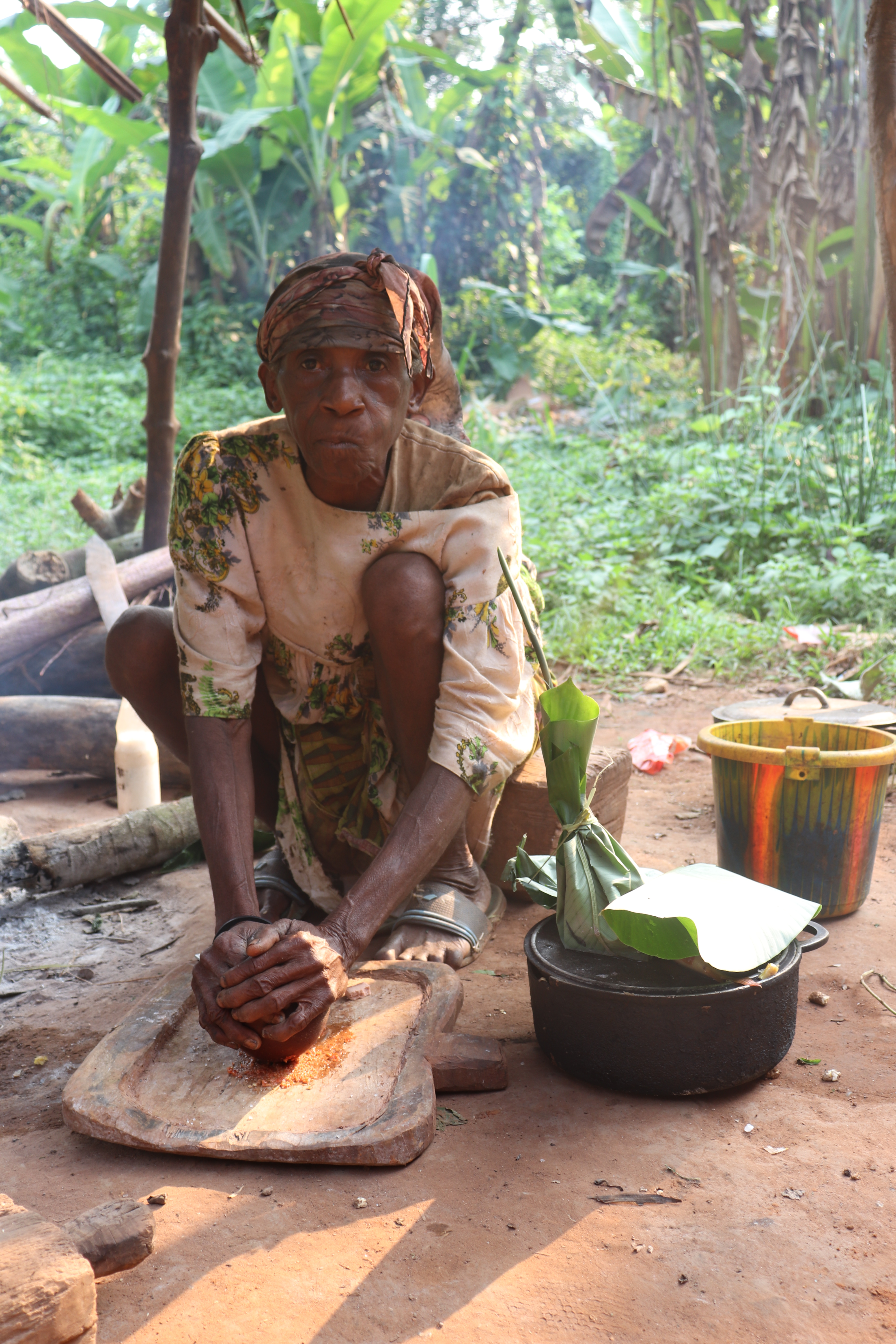 Le soir tombe. Je déambule dans le village. Devant chaque maisonnette, une marmite repose au centre d’une rosace de bois. Les femmes allument le feux pour préparer le repas. Au bout du village, les maisonnettes laissent place à de petites huttes. Ce sont des « mongoulous », l’habitation traditionnelle des Baka. A l’intérieur se trouve une simple natte tressée sur laquelle ils dorment.