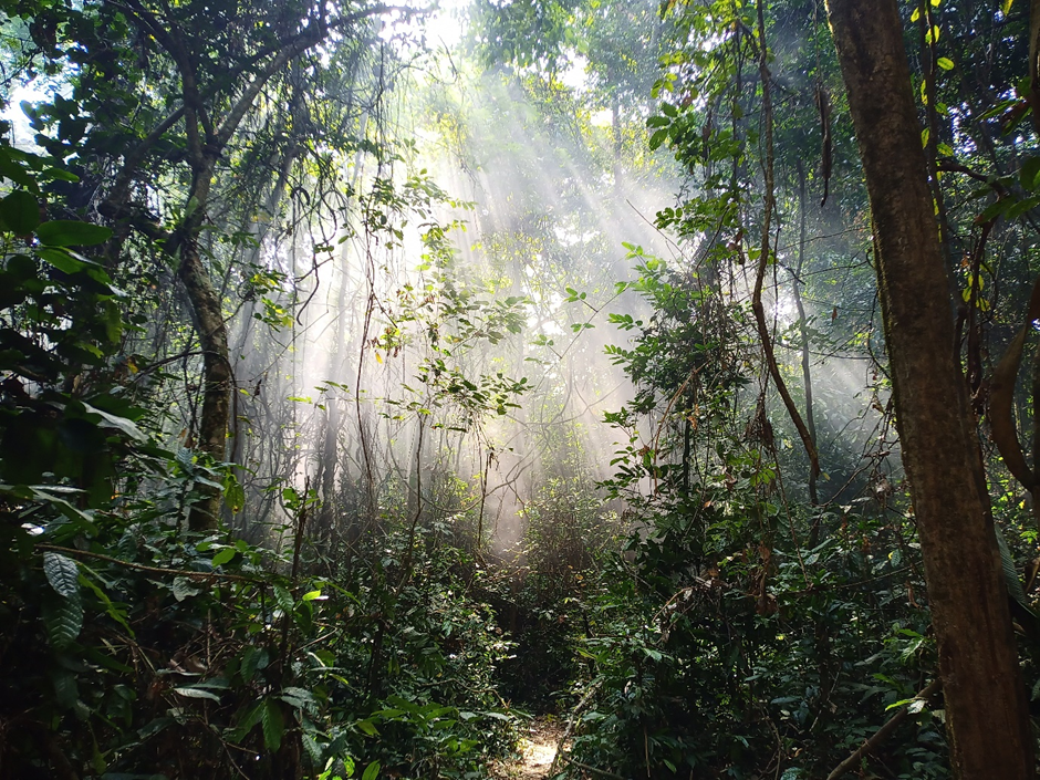 Je lève les yeux. Un soleil anonyme s’abaisse entre les arbres et révèle des feuilles d’or autour de nous. Ne pouvant ravaler le cri des oiseaux et des singes, la forêt nous ouvre son intimité la plus profonde.