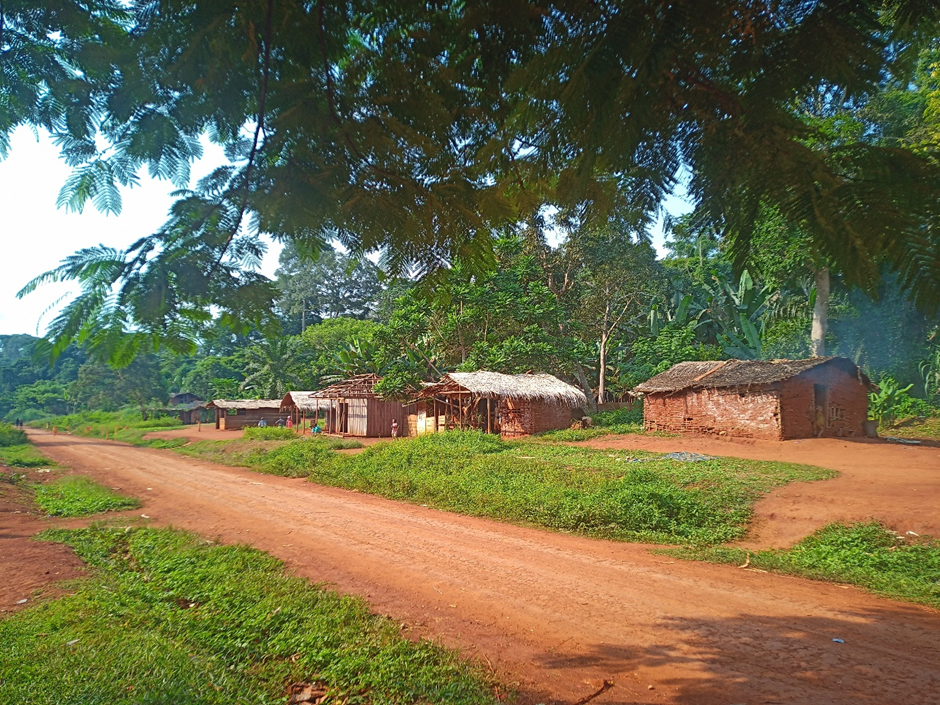 Lorsque je m’extirpe de la tente cernée par une brume épaisse, une constellation de grands yeux blancs me fixent. Le regard pesant des habitants du village me donne l’impression que ma tente cache un passage vers l’Europe. C’est la première fois qu’un blanc dort au village. Un petit enfant, tee-shirt troué, sans culotte, court le long de la route le sexe dandinant, en tenant par la queue un rat mort au poil mouillé. Il sait qu’il mangera de la viande aujourd’hui. Un jeune homme jovial aux yeux brillants vient à ma rencontre. Il tient dans sa main un petit sachet plastique d’alcool que l’on trouve facilement pour une somme dérisoire. Je m’approche du hangar de bois où sont réunis les hommes qui m’accueillent avec un « héé, Modjukwé » pour me dire bonjour. Ils attendent les doigts de plantin que leurs femmes sont en train de faire griller sur la braise. Je m’installe avec eux et contemple la fumée s’échapper mollement des petites maisons bancales de terre rouge qui bordent la forêt. Autour de nous, les enfants jouent.