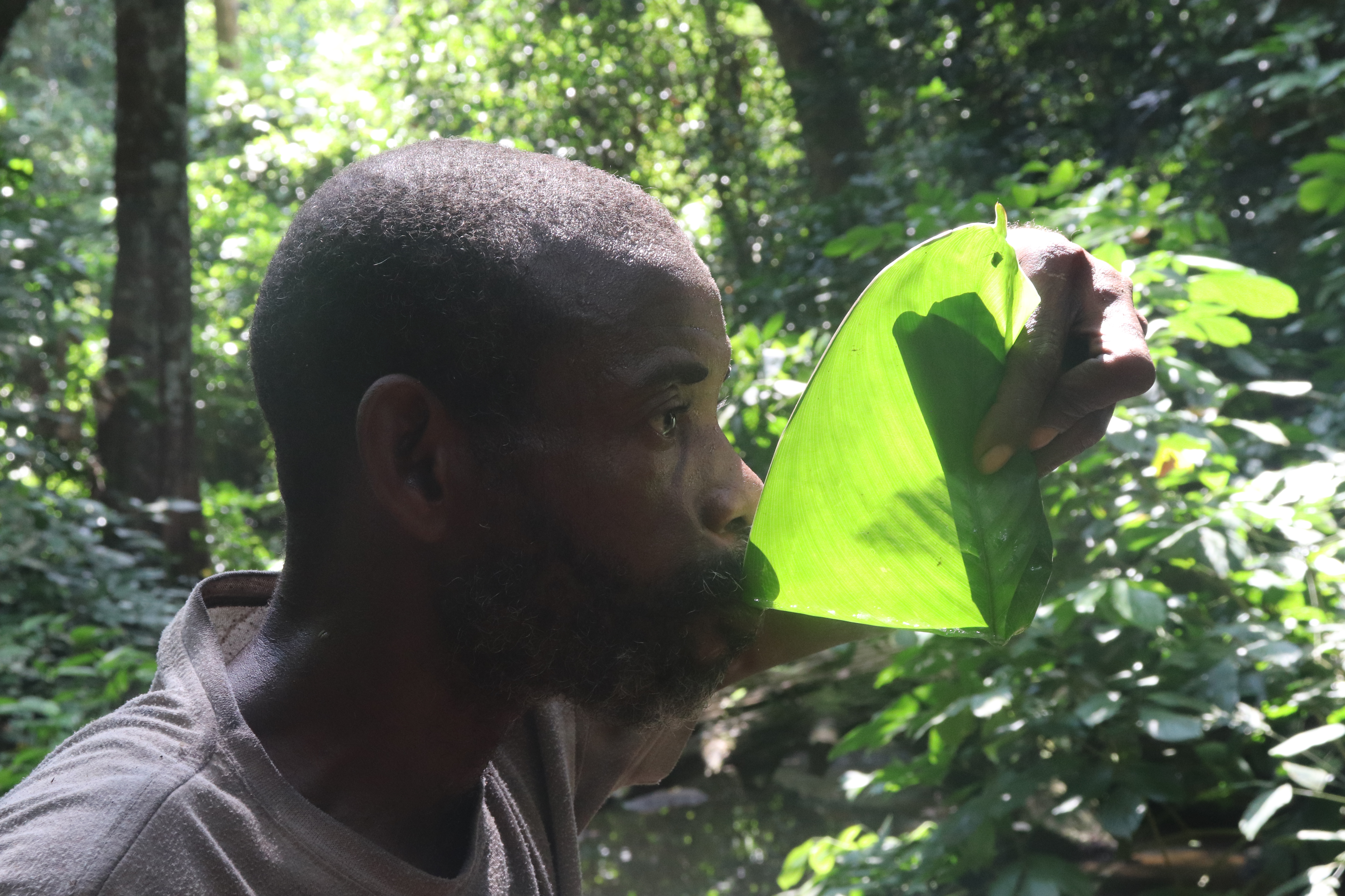 La brume lactée se dissipe et laisse place au vert. Nous entrons en forêt. Ouvrant la voie, les hommes baka, machettes à la main, entament la marche à un rythme effréné. Nous traversons les champs de plantin et de cacao ravagés par les éléphants et les gorilles. Ensuite, les grands arbres défilent. Je reconnais les essences qui meublent nos salons. Soudain, les Baka sautent sur la pointe des pieds en criant à chaque bon « Mbô, Mbô, Mbô ». C’est le signal de ceux qui marchent pieds nus pour enjamber le drapé de fourmis qui recouvre le sol. Un ruisseau interrompt notre marche. Les hommes saisissent une feuille à la volée avant de s’accroupir auprès de l’eau. Cette feuille qu’ils plient ingénieusement leur sert de récipient pour puiser l’eau claire qu’ils portent délicatement à leurs bouches.