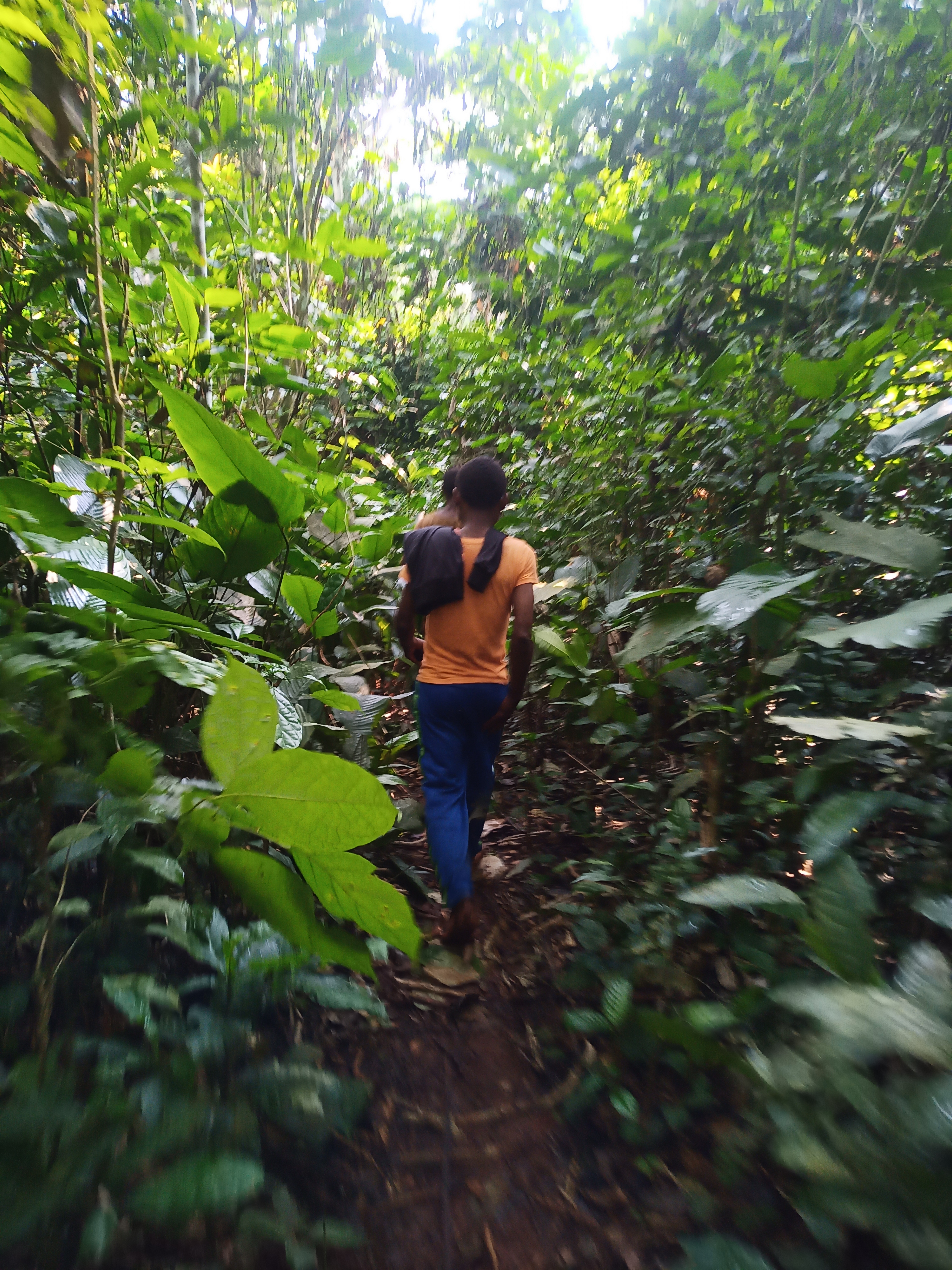 Alors que nous arrivons au village, nous croisons deux femmes qui reviennent du champs. Chacune porte sur son dos une charge démesurée de bois et de plantin suspendue par une liane qui lacère leurs fronts sanguinolant. Je contemple ces femmes à la démarche de colosse se déplaçant pas à pas devant moi. Ne pouvant tourner leurs cous vissés par le poids du fardeau, ces deux silhouettes courbées me fixent du coin de l’œil. Les hommes leurs ressemblent beaucoup tant leurs cheveux sont courts et leurs muscles saillants. Je n’aurais su distinguer ces femmes des hommes si elles ne portaient pas sur leurs flancs un nouveau-né agrippé à leurs longs seins pendants. Je remarque qu’elles n’ont qu’une seule machette pour deux et les questionne à ce sujet. Elles m’expliquent que leur machette a été volée plusieurs mois auparavant et que, n’ayant pas assez d’argent pour en racheter une – trois euros, elles utilisent l’unique machette à tour de rôle pour entretenir leur champs.