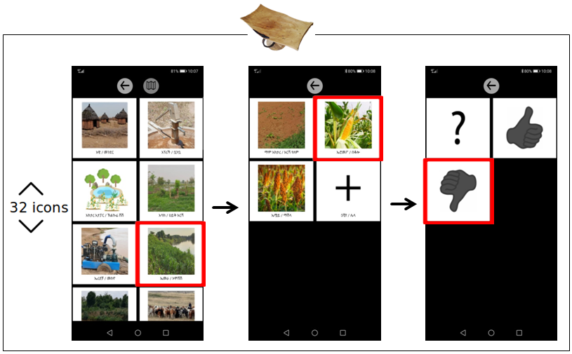 During the engagement & co-design process, once the issues faced and the potential benefits and risks of the mapping activities are identified and discussed with the communities, the technology is customised following human-centred design principles. Based on the discussions held around the question ‘What do you want to map?’, the map semantics interface (i.e. the map meaning and legend) of a Sapelli mapping app for rangelands environments is co-designed with the people engaged. These interfaces include both captions and pictograms, overcoming possible barriers from the level of education and literacy.
