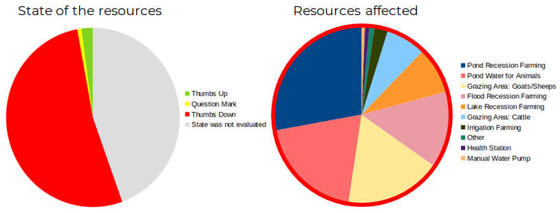 Since the mapping started in September 2021, 1600+ map contributions have been shared in the WhatsApp group. Most of the natural resources’ state is mapped as ‘Thumbs Down’, with ponds the most mapped and affected resource, both for farming (28%) and for animal watering (20%).