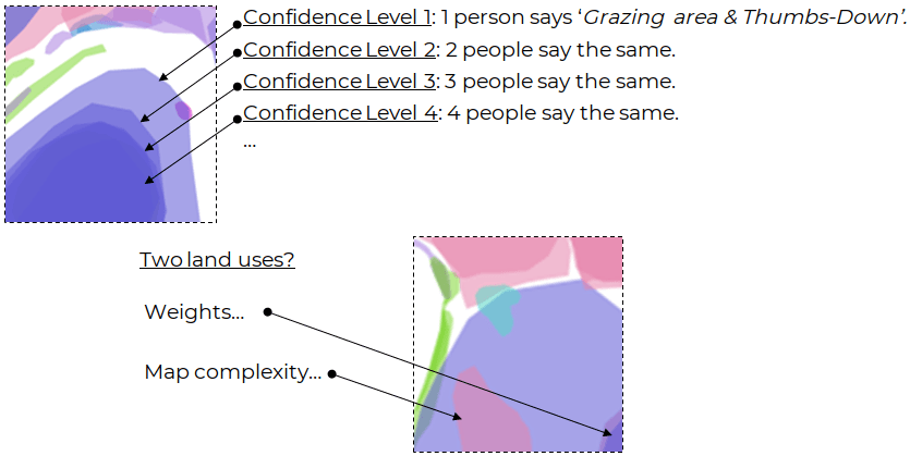 How accurate is the dynamic land use and crisis map? The answer is that it depends – As Mike McCall points out, we need to ask: Precision for Whom? (see McCall, 2006). One of the many questions that emerges is ‘How can we quantify the accuracy of a polygon that aims to represent the fuzzy and dynamic boundaries of a grazing and/or hunting area?’ One short answer is that this can’t be done without acknowledging both the potential and the fundamental limitations of machines to learn how to process digital geographic information that aims to represent local land knowledge. What stakeholders (in-the-loop) can do is to put appropriate validation mechanisms in place to discard ‘clearly wrong’ and inappropriate geometries and then quantify precision where needed. For instance, if many local people classify a piece of land as ‘grazing area’, then the chances that this piece of land (or a group of pixels) is used for grazing is higher than if fewer local people classify it similarly or differently. See the validity of Linus’ law to crowdsourced geographic information in Haklay et al. (2013). In short, the more map contributions, the better the map.