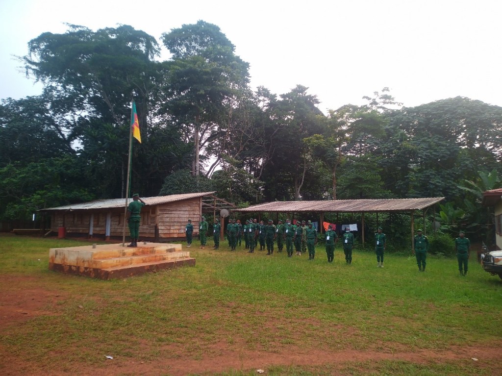 Le drapeau du Cameroun se dresse lentement et en silence au-dessus des écogardes alignés au garde-à-vous. Les couleurs du drapeau font échos à l’uniforme vert des soldats. Ce vert symbolise la forêt que protège le corps des écogardes. Nous sommes au Parc National de Lobéké, à la pointe Sud-Est du Cameroun, à la frontière avec la République du Congo et la République Centrafricaine. Ce parc et ses alentours accueillent l’une des biodiversités les plus riches d’Afrique centrale qui attire de nombreux braconniers provenant non seulement du Cameroun mais aussi des pays frontaliers. Les écogardes jouent un rôle clef dans la région en marquant leur présence dans le parc et ses alentours pour lutter contre la criminalité faunique.