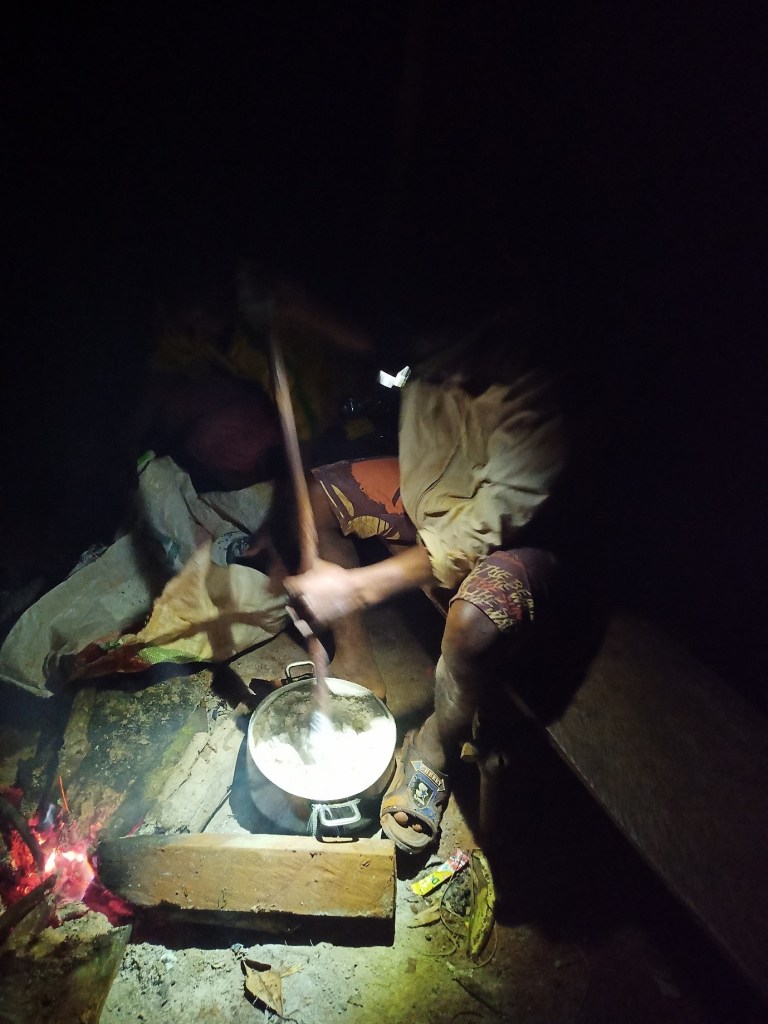 Les écogardes sont très bavards. Ils enchainent les blagues et les commérages pour rendre le voyage plus agréable. L’odeur du poisson séché et d’essence embaume l’habitable dans lequel nous sommes sérés comme des sardines. A chaque fois que le 4×4 heurte un nid-de-poule sur cette route chaotique, je me retrouve broyé par les deux volumineux camerounais qui me bordent. Heureusement, il nous faut régulièrement faire des pauses. Souvent, nous devons déblayer la route à coups de tronçonneuse et de machette pour couper les arbres au sol qui entravent la progression du véhicule. La nuit tombe déjà lorsque le 4×4 s’arrête. Nous allumons les frontales et entamons une marche jusqu’au camps de base. Dans une mécanique parfaitement huilée nous allumons le feu et installons nos tentes. Mes équipements de camping contrastent avec la vétusté des leurs. Certains écogardes n’ont pas de tente, d’autres pas de vêtements de pluie. De nombreux écogardes manquent d’un équipement de base depuis des années – quelques mois plus tard ils recevront un équipement neuf et complet. Un écogarde tourne le couscous pour préparer un repas sans fioriture, vite avalé. La bonne ambiance s’éternise autour du feu et des rires.