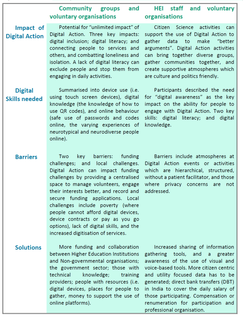 The roundtables provided space for people from across the UK, Continental Europe and North America to explore ideas about the impact in communities of using Digital Action, what community groups and voluntary organisations need for Digital Action, which digital skills are essential, and how HEIs can offer opportunities to develop such digital skills. Participants described their experience working to support local communities—particularly older people, emigrants, and local deprived communities—charities, and voluntary organisations with digital inclusion, either to onboard and manage volunteers with digital platforms or provide digital skills, technology, and tools (either at affordable cost or zero cost) one-to-one, in group settings, or pre-existing networks (such as through foodbanks or Age UK).